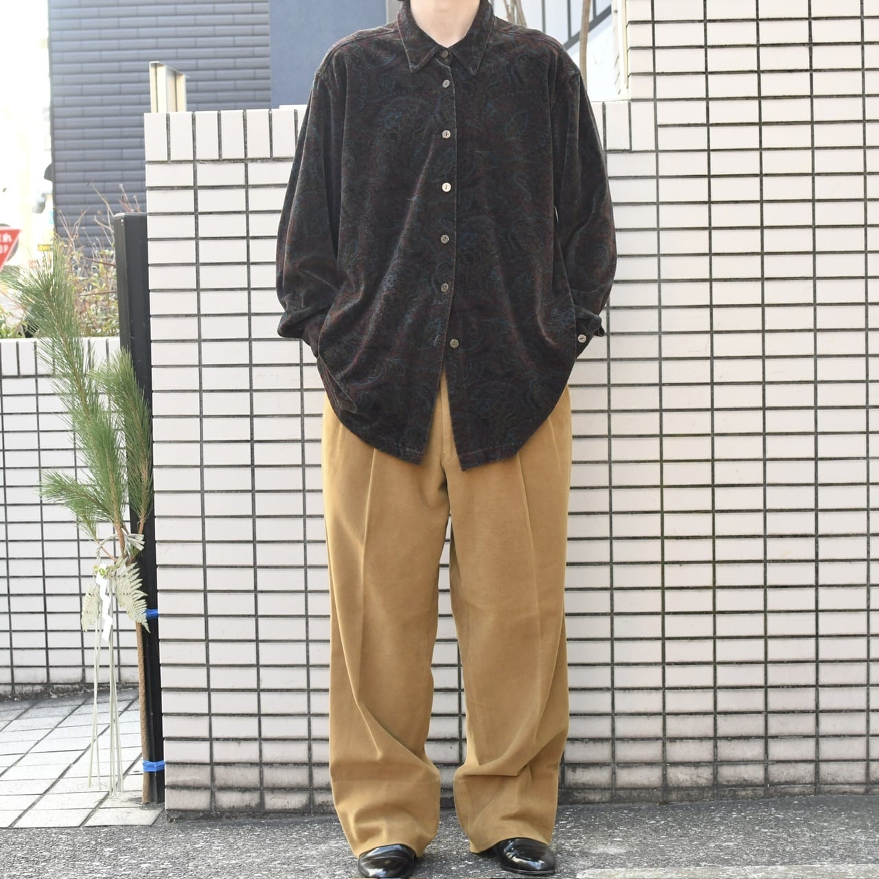 ダークブラウンのベロア生地にペイズリー柄という