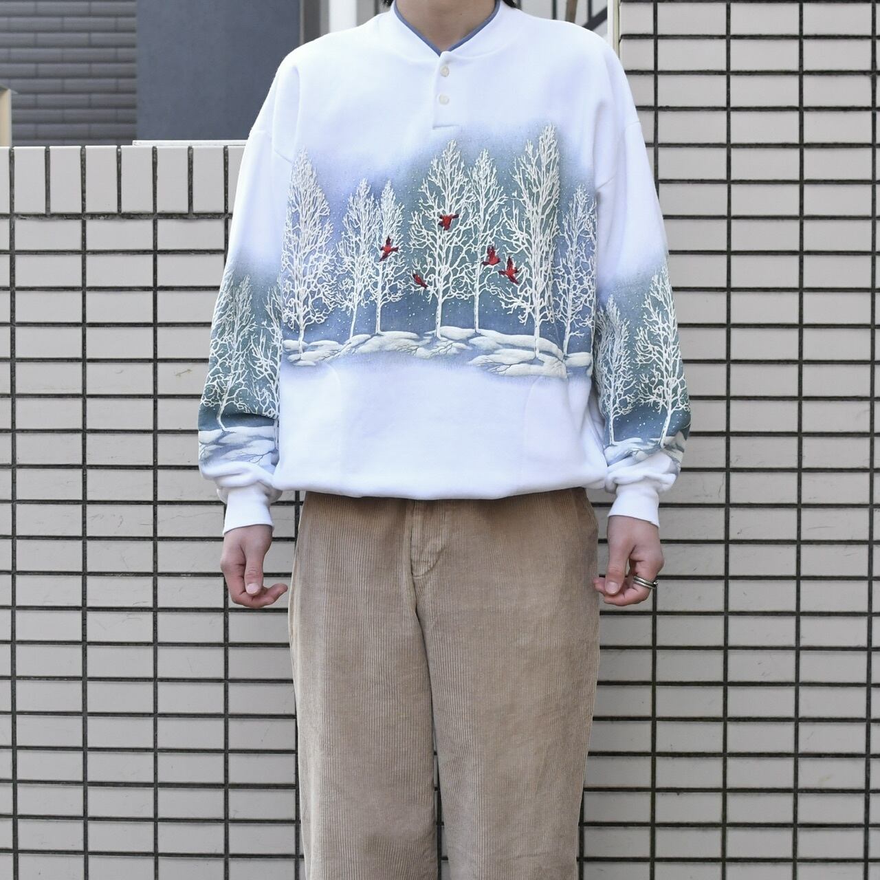 首元はレイヤード、そしてヘンリーネックタイプで