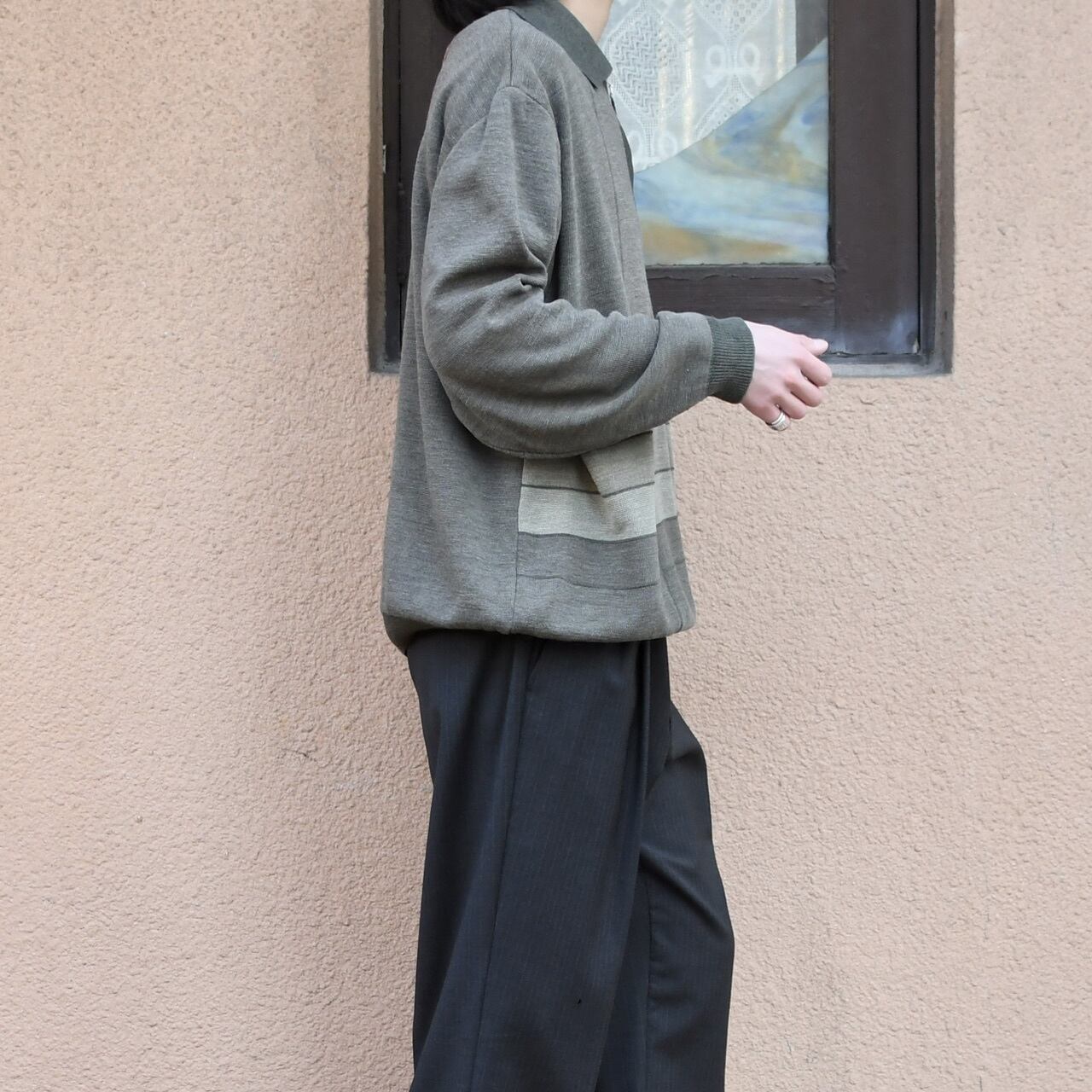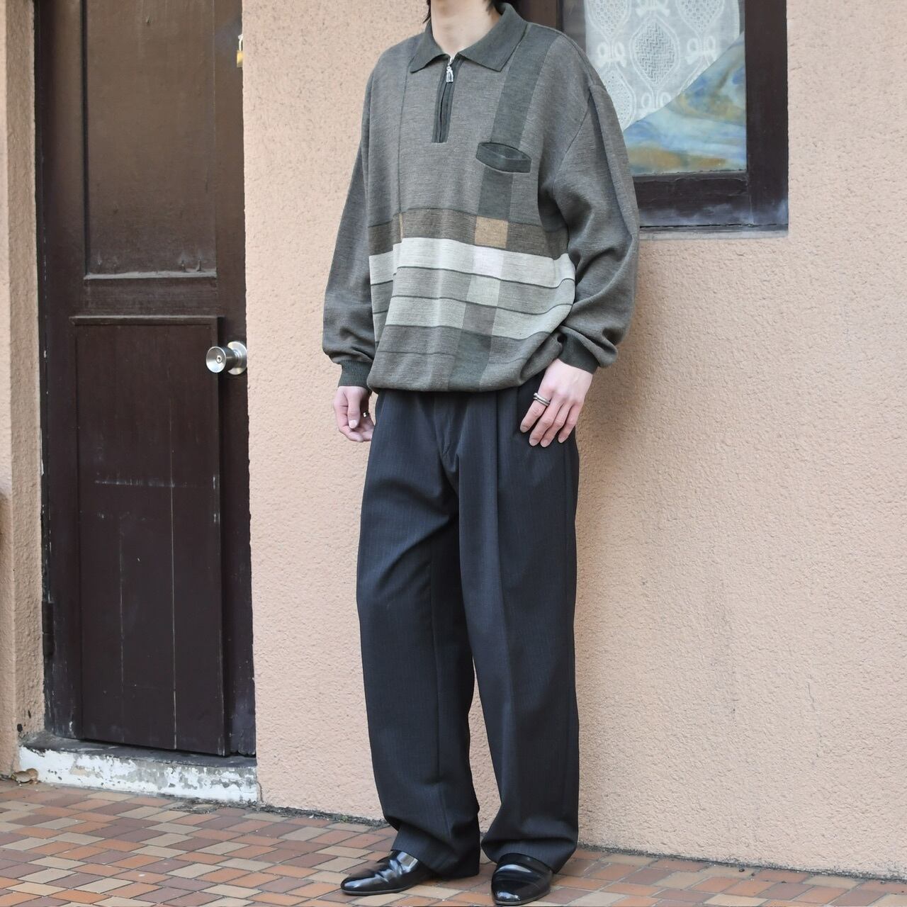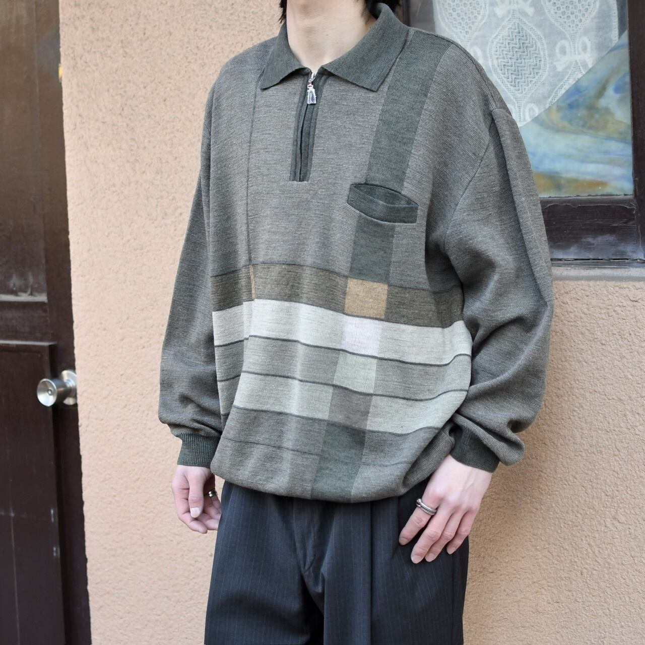大人びた印象を纏うニットポロですが、そこへハーフジップ特有のややスポーティな雰囲気が加わり