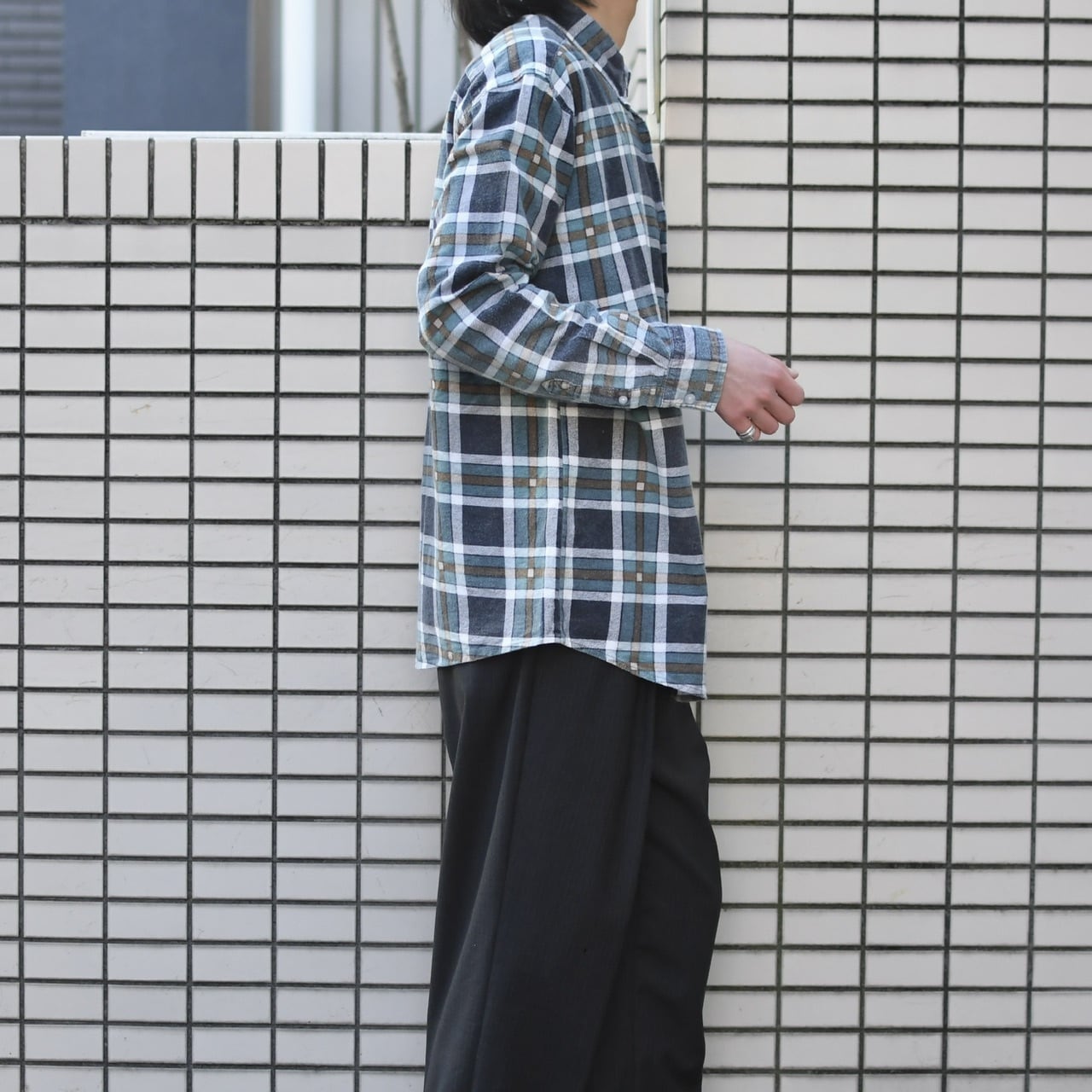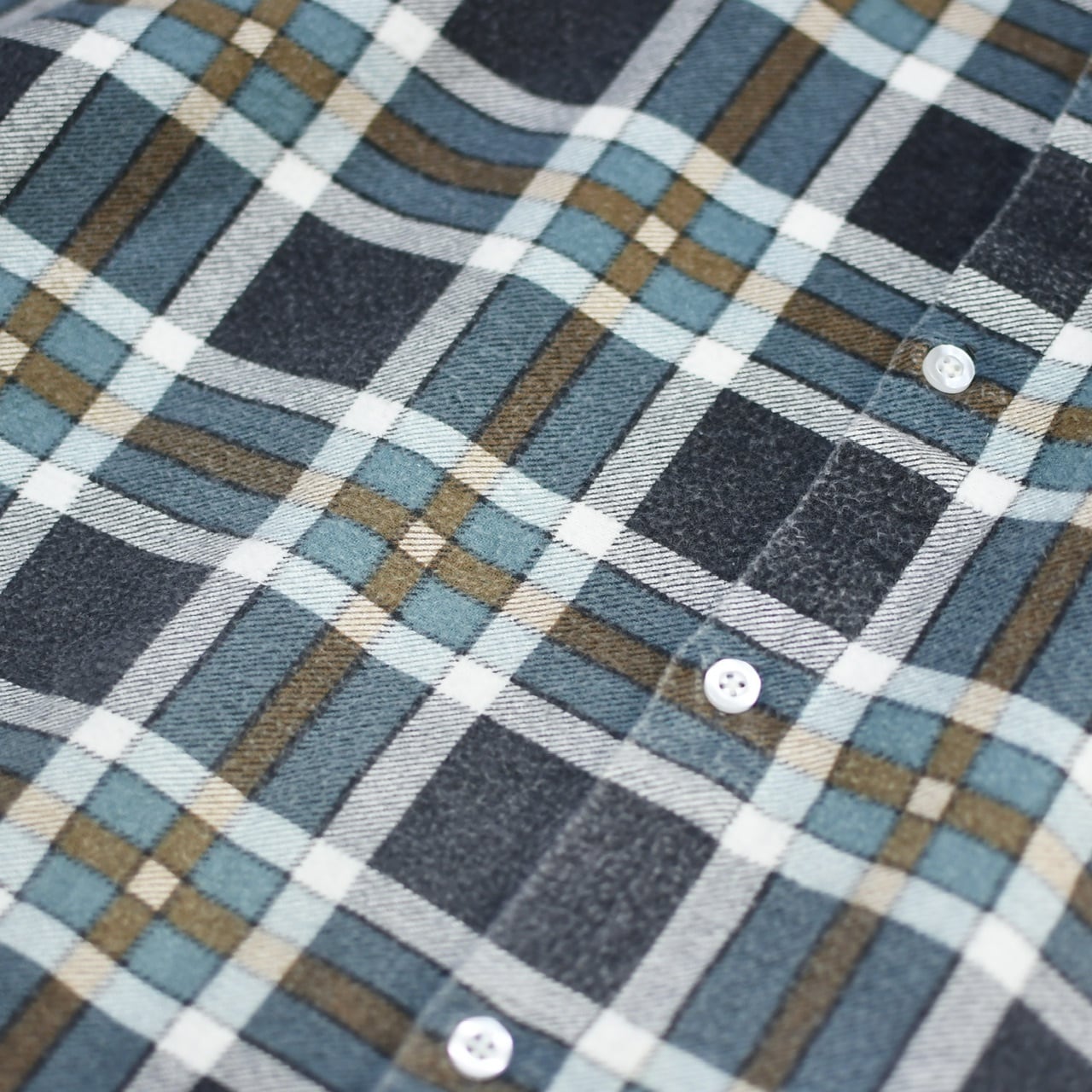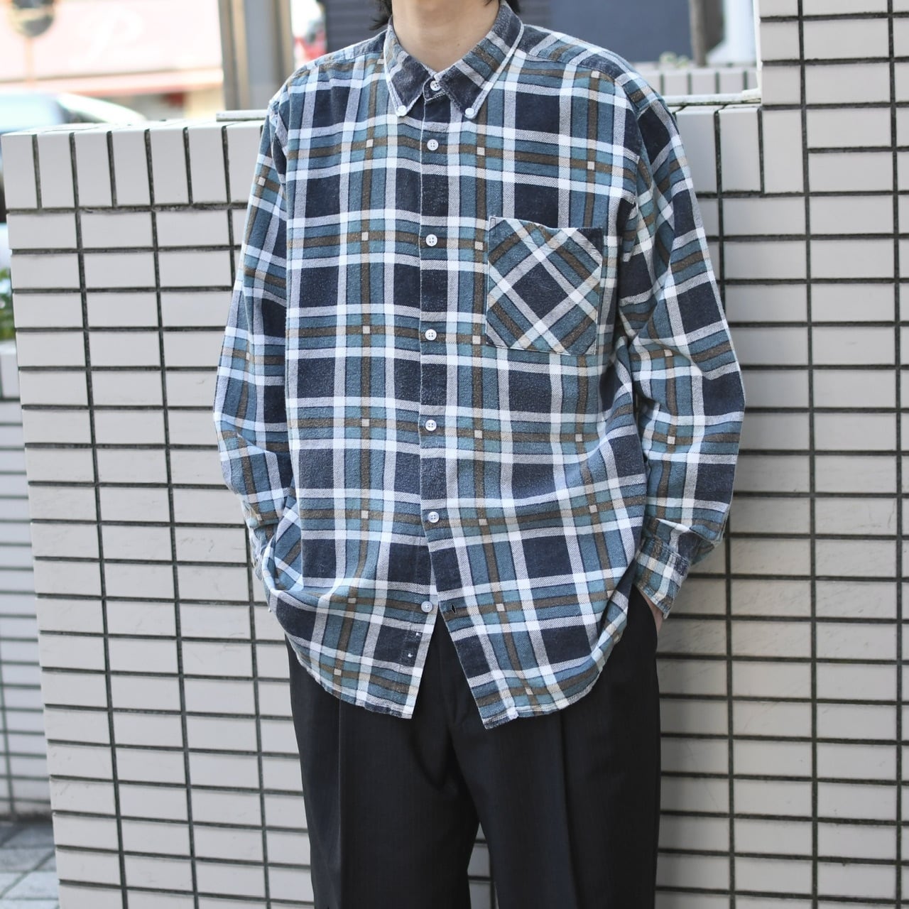 独特な色使いは、トラディショナルな雰囲気というよりか、良い意味で現代的というか、古着のチェックシャツの中では新鮮さを感じました。