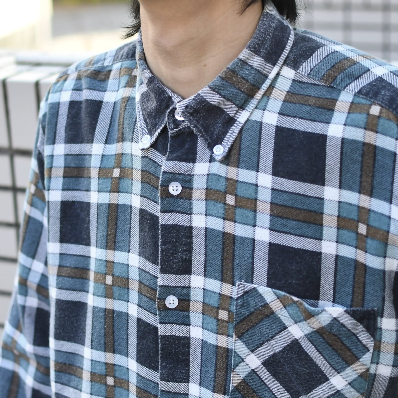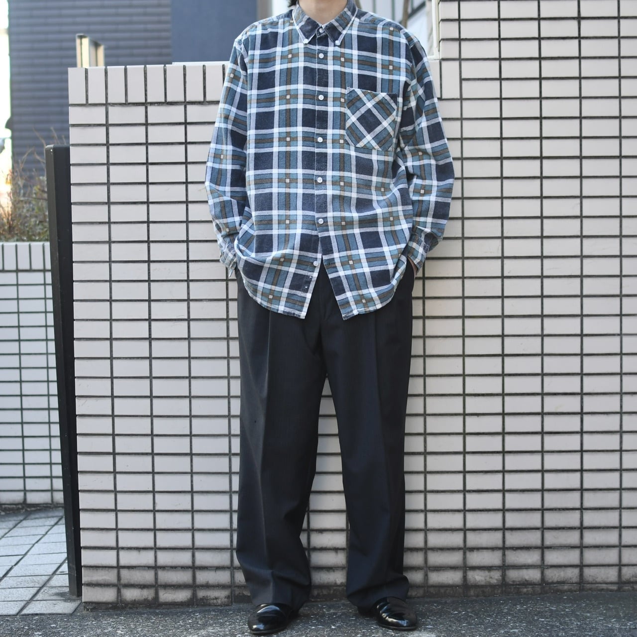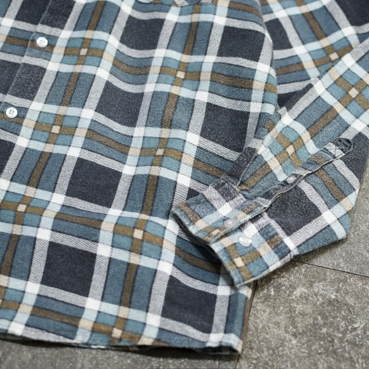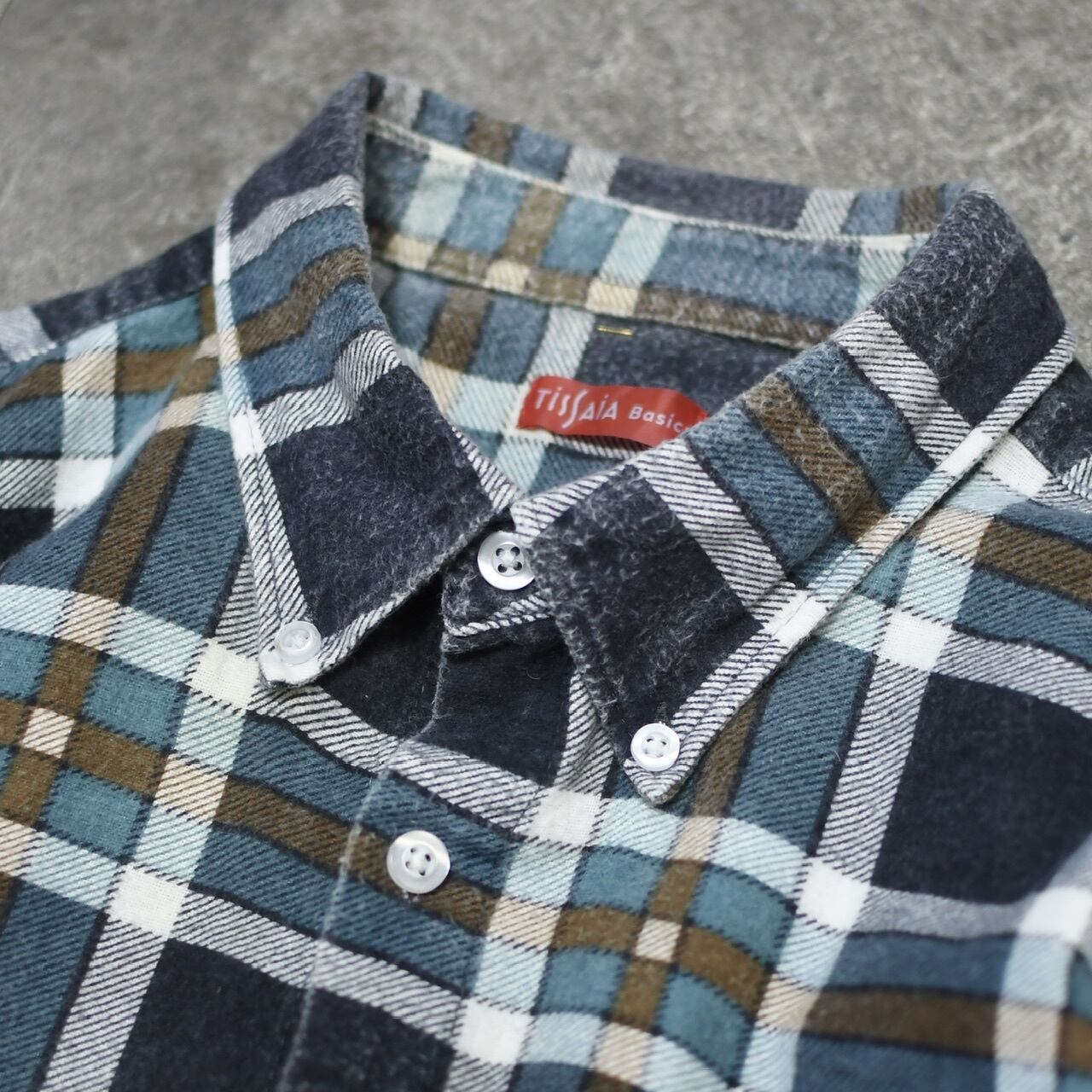 独特な色使いは、トラディショナルな雰囲気というよりか、良い意味で現代的というか、古着のチェックシャツの中では新鮮さを感じました。