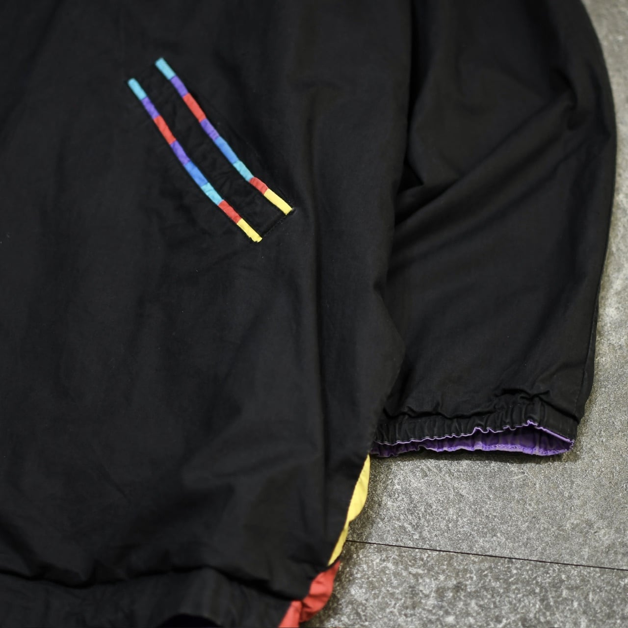 裾からアームにまで施された5色の切替。