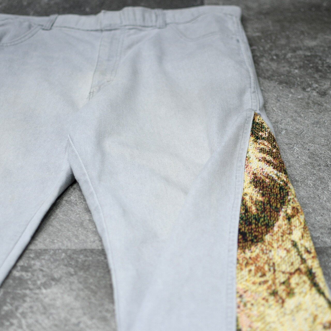 グレーのデニムパンツのサイドに、ラグを差し込み